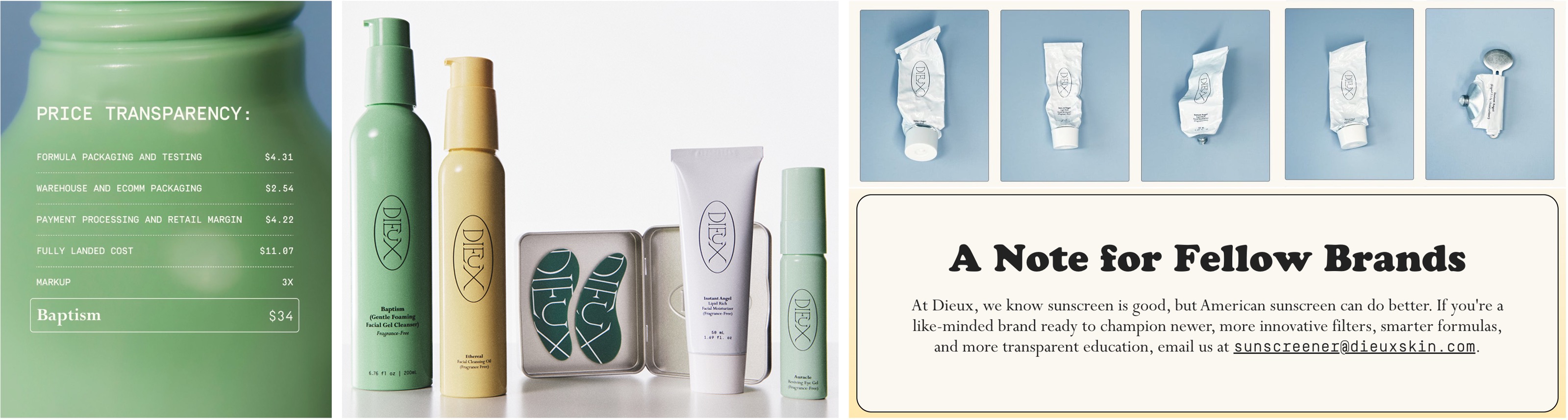 Price transparency, packaging, and messaging from Dieux (Source: Dieux official website and Instagram)