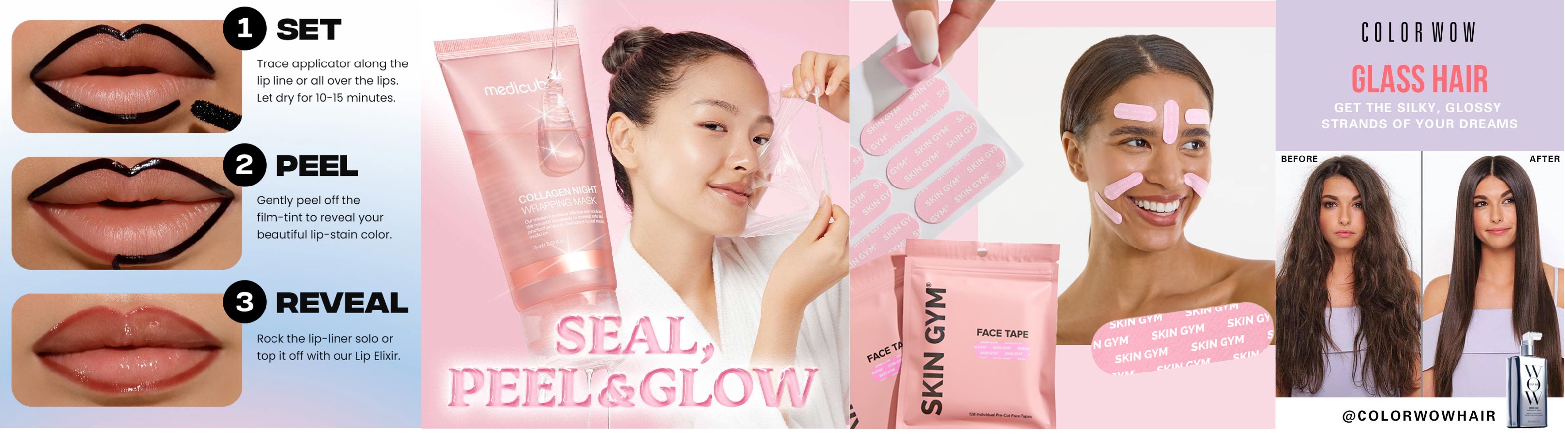 From Left to Right: LIP LINER STAY-N® (Source: Sacheu Beauty official website); Medicube Collagen Night Wrapping Mask (Source: Medicube official website); Skin Gym Face Tape (Source: Skin Gym  official website); Color Wow Dream Coat Supernatural Spray (Source: Color Wow official website)