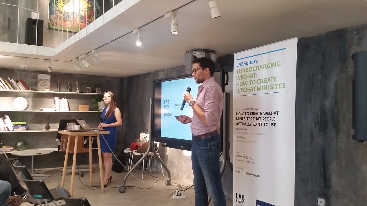 SHANGHAI, July 9, 2015 – Labbrand partnered with KRDS to host a LABSquare breakfast seminar themed Turbocharging WeChat:A guide to creating Wechat mini sites that people actually want to use on July 9th 2015 at Kokuyo Showroom in Shanghai, China. The two speakers, Kevin Gentle from Labbrand and Elise Chen from KRDS,shared about best design practices, how to best use WeChat’s APIs, and how brands can use their mini sites to add depth to their WeChat presence and drive customer action. Kevin and Elise underlined the point that brands should know exactly what they want to achieve with a WeChat mini site before investing in one.
